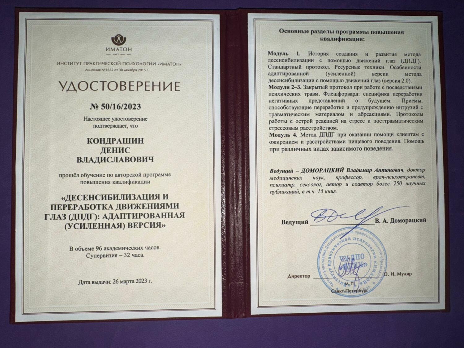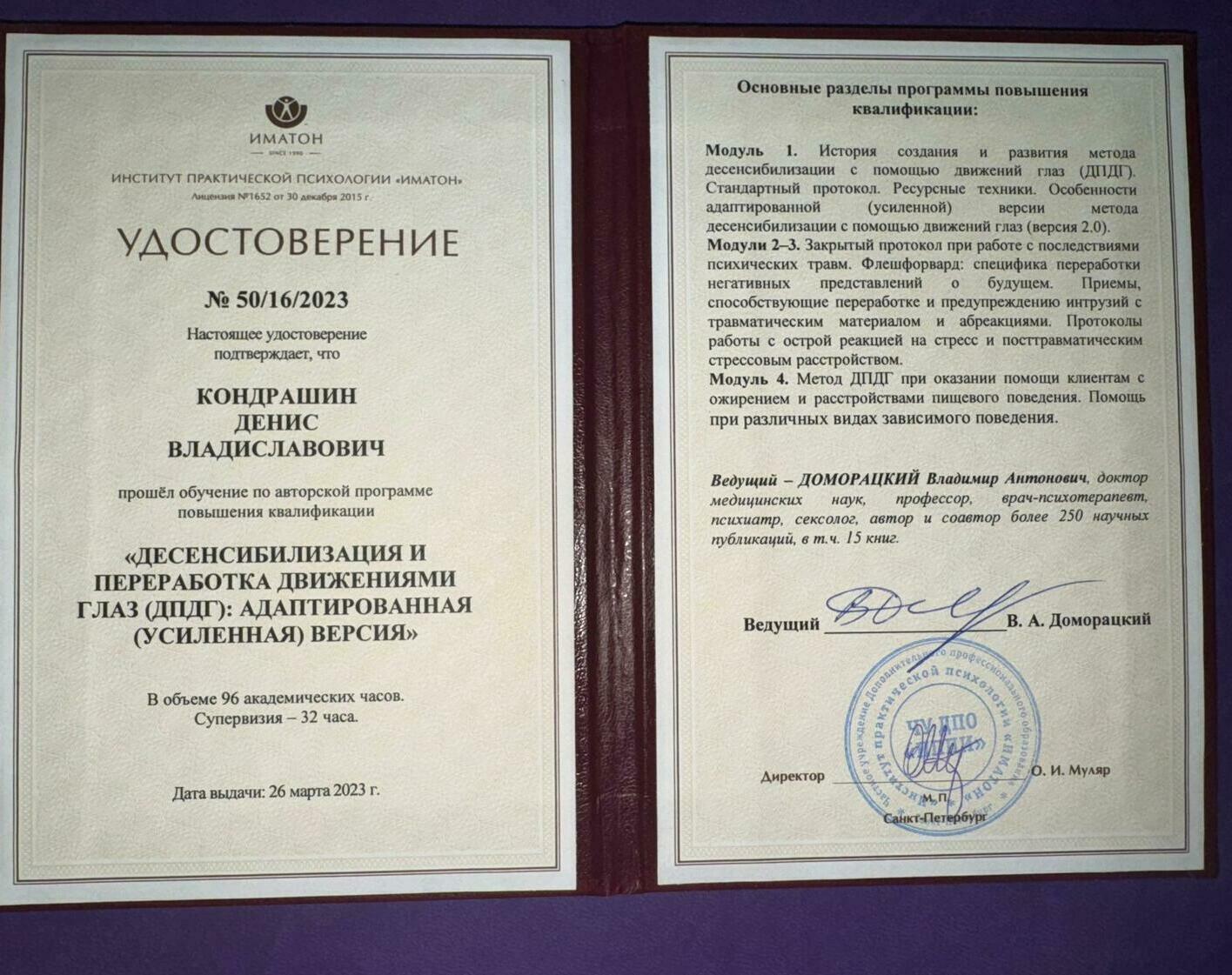 Провожу работу с психологической травмой методом ДПДГ (EMDR). Диплом института "Иматон".