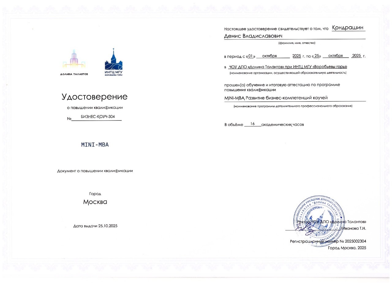 Прошел курсы дополнительного образования программы "Коучинг" + "Бизнес-коучинг" мини МБА от ИНТЦ МГУ «Воробьёвы горы».