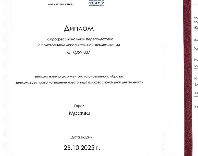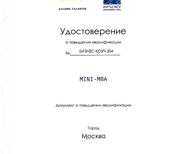 Прошел курсы дополнительного образования программы "Коучинг" + "Бизнес-коучинг" мини МБА от ИНТЦ МГУ «Воробьёвы горы».